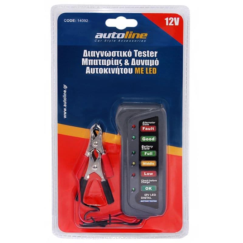 Το διαγνωστικό tester μπαταρίας με τις 6 ενδείξεις LED σας βοηθά να ελέγχετε την υπολειπόμενη διάρκεια ζωής & την κατάσταση της μπαταρίας του αυτοκινήτου σας σε λίγα μόνο δευτερόλεπτα. Απλώς προσαρμόστε τους ακροδέκτες στους πόλους της μπαταρίας και η αντίστοιχη ένδειξη led θα σας ενημερώσει άμεσα για την κατάσταση της. • Κατάλληλο για οχήματα και μηχανές με 12 Volt μπαταρία • Μικρό μέγεθος και ελαφρύ, βολικό στη μεταφορά • Εύκολο και ασφαλές στη χρήση, χωρίς σπινθήρες • Mε τσιπ προστασίας στο εσωτερικό, που δεν του επιτρέπει να ζεσταίνεται η επιφάνεια • Με 6 λυχνίες LED που δείχνουν την κατάσταση της μπαταρίας Πολλαπλές λειτουργίες: • Έλεγχος κατάστασης δυναμό (Alternator State) • Έλεγχος κατάστασης της μπαταρίας (Battery State) • Έλεγχος πριν τη φόρτιση (Check Before Charge State) • Έλεγχος για υπερφόρτιση