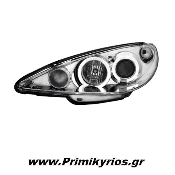 Φανάρι εμπρός 2 Halo Rims για τοποθέτηση σε αυτοκίνητο Peugeot 206, μοντέλο έτους 2002 έως 2007. Τα φανάρια διατίθενται σε δύο χρώματα : μαύρο και chrome.