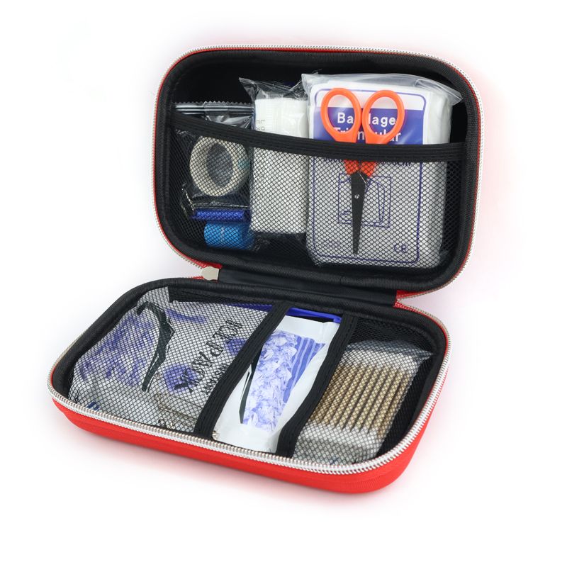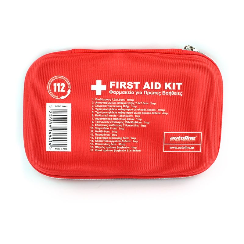 1. Επιδέσμους 7.2x1.9cm: 10τεμ 2. Αποστειρωμένο επίθεμα γάζας 7.5x7.5cm: 2τεμ 3. Στιγμιαία παγοκύστη 100g: 1τεμ 4. Υγρά μαντηλάκια καθαρισμού με αλκοόλ 5x5cm: 10τεμ 5. Υγρά μαντηλάκια καθαρισμού χωρίς αλκοόλ 6x8cm: 4τεμ 6. Κολλητική ταινία 1.25x450cm: 1τεμ 7. Αιμοστατικός επίδεσμος 46cm: 1τεμ 8. Τριγωνικός επίδεσμος 136x96x96cm: 1τεμ 9. Ελαστικός επίδεσμος 7.5cmx4.5m: 1τεμ 10. Τσιμπιδάκι 11cm: 1τεμ 11. Ψαλίδι 9cm: 1τεμ 12. Παραμάνες: 5τεμ 13. Σφυρίχτρα διάσωσης 5cm: 1τεμ 14. Κάρτα Πολυεργαλείο 5x8cm: 1τεμ 15. Μπατονέτες 8cm: 30τεμ 16. Οδηγός πρώτων βοηθειών: 1τεμ 17. Κουτί πρώτων βοηθειών 21x13x5cm