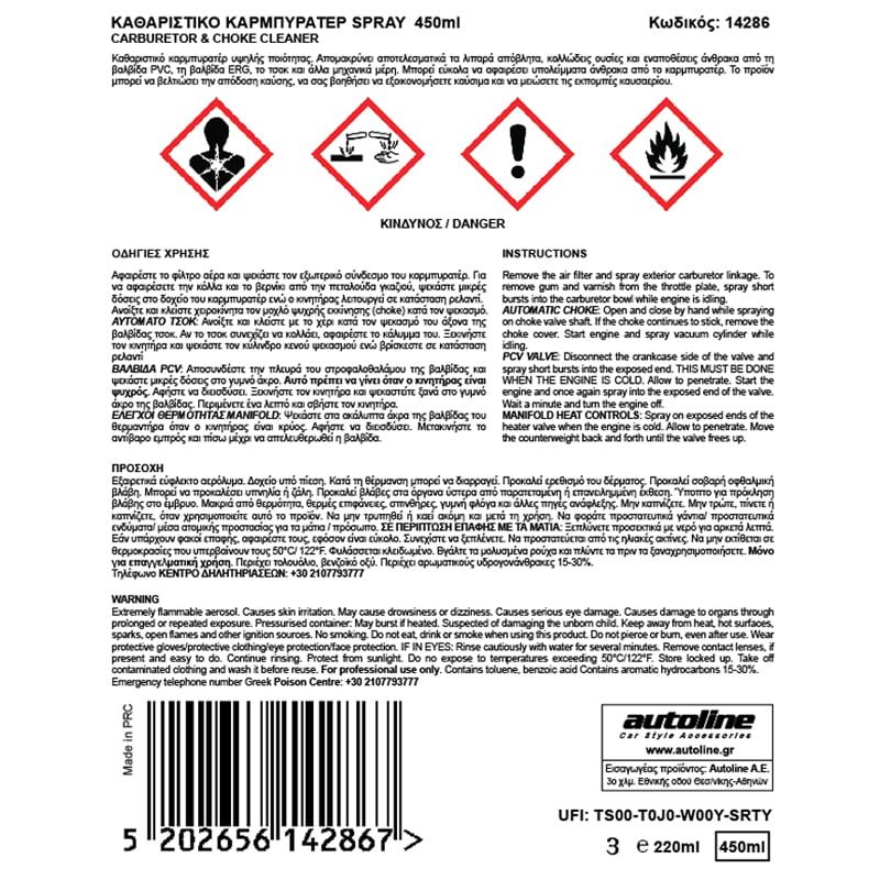 Καθαριστικό καρμπυρατέρ υψηλής ποιότητας. Απομακρύνει αποτελεσματικά τα λιπαρά απόβλητα, κολλώδεις ουσίες και εναποθέσεις άνθρακα από τη βαλβίδα PVC, τη βαλβίδα ERG, το τσοκ και άλλα μηχανικά μέρη. Μπορεί εύκολα να αφαιρέσει υπολείμματα άνθρακα από το καρμπυρατέρ. Το προϊόν μπορεί να βελτιώσει την απόδοση καύσης, να σας βοηθήσει να εξοικονομήσετε καύσιμα και να μειώσετε τις εκπομπές καυσαερίου. Κιβώτιο: 24 τεμ.