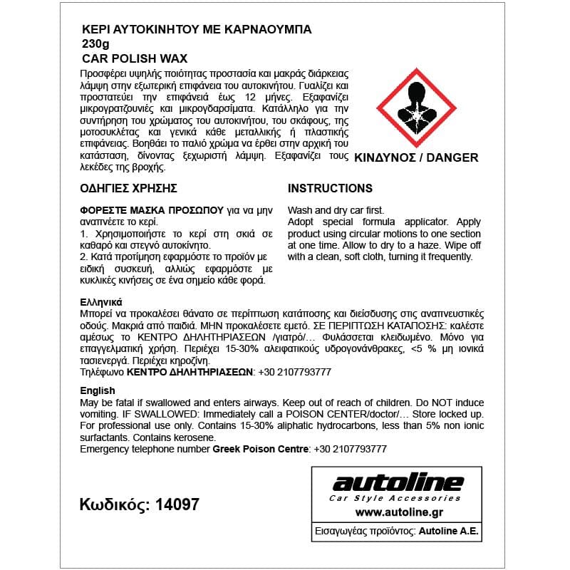 Προσφέρει υψηλής ποιότητας προστασία και μακράς διάρκειας λάμψη στην εξωτερική επιφάνεια του αυτοκινήτου. Γυαλίζει και προστατεύει την επιφάνειά έως 12 μήνες. Εξαφανίζει μικρογρατζουνιές και μικρογδαρσίματα. Κατάλληλο για την συντήρηση του χρώματος του αυτοκινήτου, του σκάφους, της μοτοσυκλέτας και γενικά κάθε μεταλλικής ή πλαστικής επιφάνειας. Βοηθάει το παλιό χρώμα να έρθει στην αρχική του κατάσταση, δίνοντας ξεχωριστή λάμψη. Εξαφανίζει τους λεκέδες της βροχής. ΠΡΟΣΟΧΗ! Μην το αγγίζετε με γυμνά χέρια, μόνο με γάντια. Μην το μυρίζετε. Κιβώτιο: 12 τεμ.