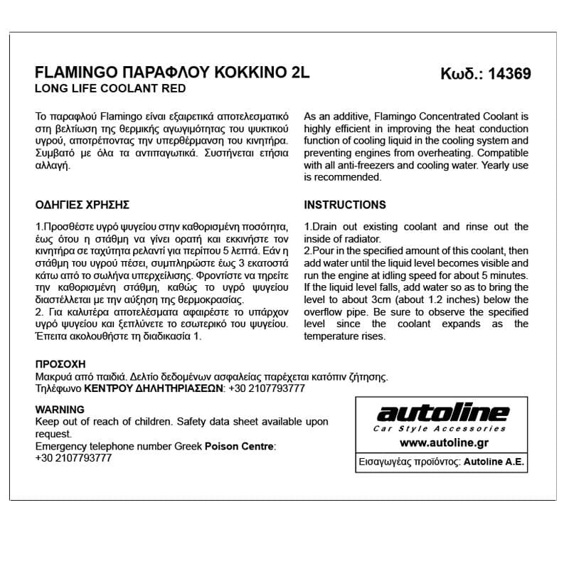 Το Κόκκινο Αντιψυκτικό Flamingo είναι εξαιρετικά αποτελεσματικό στη βελτίωση της λειτουργίας της θερμικής αγωγιμότητας του υγρού στο σύστημα ψύξης, αποτρέποντας τους κινητήρες από την υπερθέρμανση. Συμβατό με όλα τα αντιψυκτικά και το υγρό ψύξης. Με αντισκωριακές ιδιότητες. Μη συμπυκνωμένο. Έτοιμο προς χρήση. Εύρος ικανοποιητικής απόδοσης πάνω από 0°C έως +104°C. Συστήνεται ετήσια αλλαγή. Κιβώτιο: 6 τεμ.