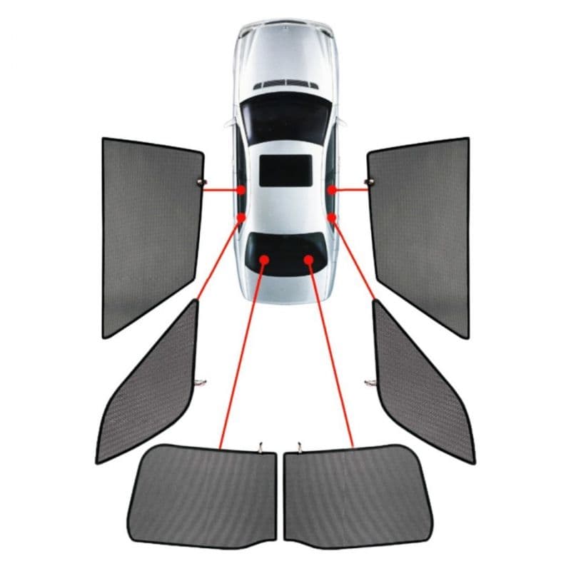 Κουρτινάκια για ηλιοπροστασία από την εταιρία CAR SHADES, βρετανικής κατασκευής και προέλευσης, ειδικά σχεδιασμένα για ταιριάζουν ακριβώς στα πίσω παράθυρα και το πίσω παρμπρίζ του οχήματος. Κατασκευασμένα από υψηλής ποιότητας διάτρητο υλικό σε μαύρο χρώμα, προσφέρουν 100% ιδιωτικότητα, κάλυψη, αντιηλιακή προστασία από UV ακτινοβολία και κομψή αισθητική.