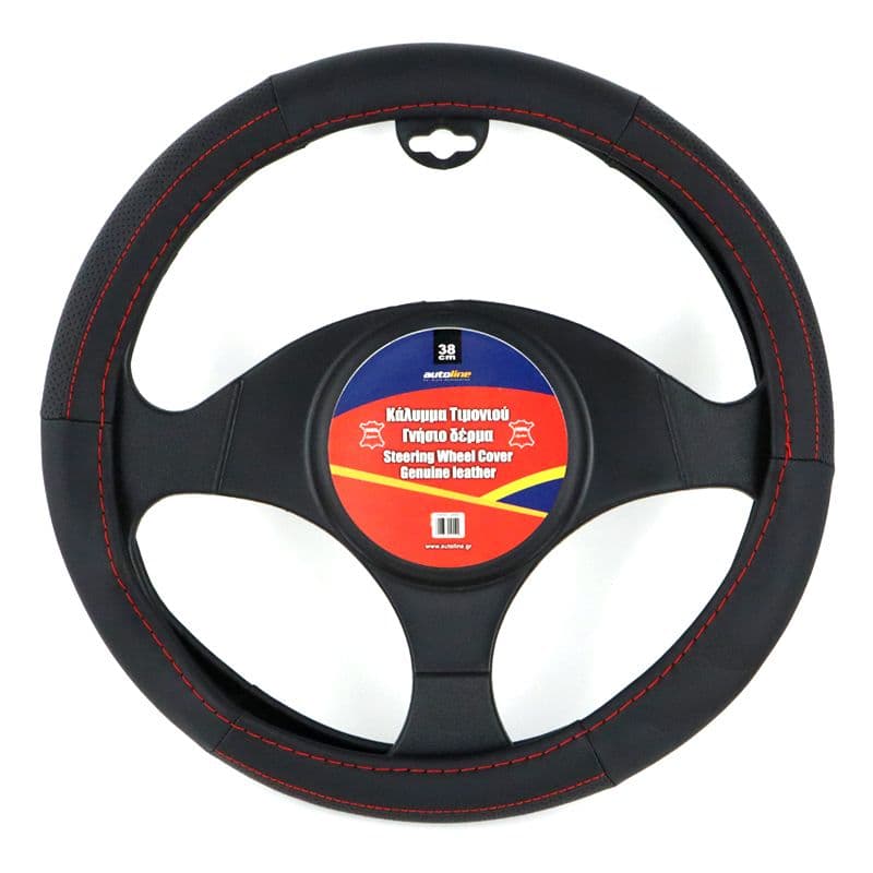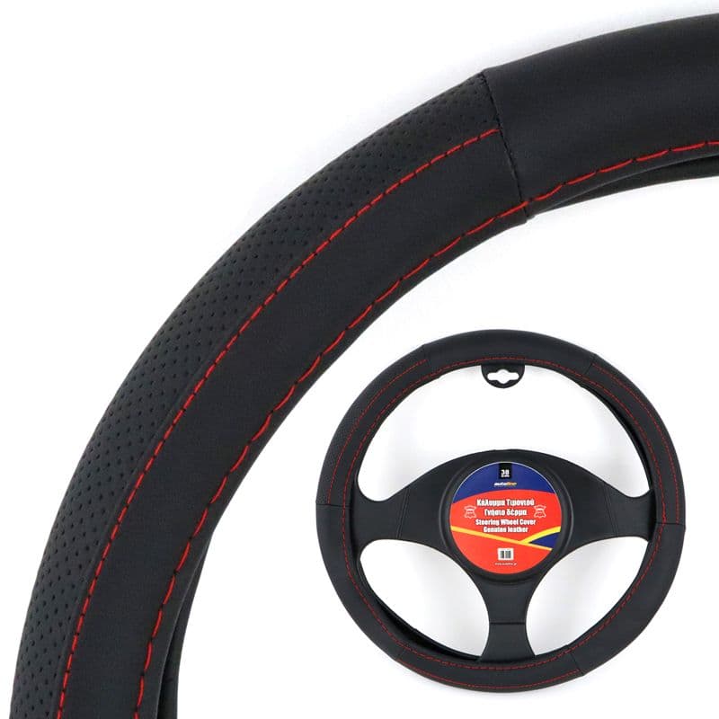 Κάλυμμα τιμονιού αυτοκινήτου για τιμόνια 38εκ. Είναι κατασκευασμένο από δέρμα, υλικό που είναι εξαιρετικά λείο, με απαλή υφή και αντίσταση στους λεκέδες. Το δέρμα προσφέρει μια "φυσική" αίσθηση στο χέρι κατά την οδήγηση. Παράλληλα προστατεύει από τη φθορά και βελτιώνει την εσωτερική όψη του αυτοκινήτου. Μέγεθος: 38cm