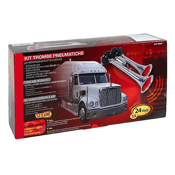 Κόρνα φορτηγού διπλή πνευματική 24V/5A/125db ενός ήχου με μήκος της κάθε τρομπέτας 23 και 30cm με ηλεκτροβαλβίδα. Περιλαμβάνει εξαρτήματα στερέωσης, εύκολη στην τοποθέτηση.