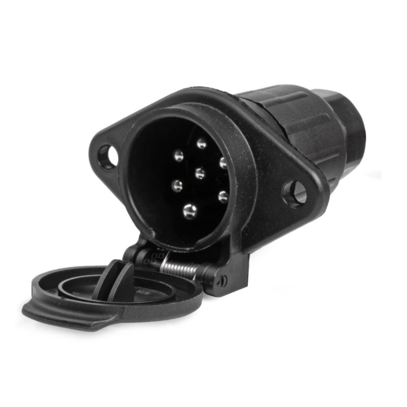 ΠΡΙΖΑ ΚΟΤΣΑΔΟΡΟΥ 7ΦΙΣ TYPE-N 24V ΑΡΣΕΝΙΚΟ ΑMiO - 1 TEM. Πρίζα κοτσαδόρου με 7 φις αρσενικό TYPE-N 24V, από την εταιρεία ΑMiO, πολωνικής προέλευσης. Universal πρίζα τύπου N 7 ακίδων που έχει σχεδιαστεί για τη σύνδεση και την τροφοδοσία του ηλεκτρικού συστήματος 24V σε ημιρυμουλκούμενα, ρυμουλκούμενα βαρέως τύπου και άλλα βαρέα οχήματα. Εξασφαλίζει τη μόνιμη σύνδεση της ηλεκτρικής εγκατάστασης του ρυμουλκούμενου με το ρυμουλκό όχημα, διασφαλίζοντας την αδιάλειπτη λειτουργία των διαθέσιμων λειτουργιών (π.χ. φωτισμός). Ο σχεδιασμός επιτρέπει την εύκολη συναρμολόγηση και αποσυναρμολόγηση Κλειστό με πτερύγιο που προστατεύει από τυχαίο άνοιγμα όταν το καλώδιο δεν είναι συνδεδεμένο Ανθεκτικό στις φθορές και στις καιρικές συνθήκεςμε περίβλημα από σκληρό πλαστικό Διαθέτει δύο οπές στερέωσης -Τάση: 24V -Σύνδεσμος: Υποδοχή τύπου N 7 ακίδων -Περίβλημα: συμπαγές πλαστικό -Σύνδεση: βιδωτή -Τρύπες στερέωσης: 2 -Μέγιστη διάμετρος καλωδίου (λαστιχένιο κάλυμμα): 10,3 mm -Χρώμα: μαύρο. -Συνολικό μήκος: 85 mm -Βάρος: 140 γρ. Συσκευασία 1 τεμαχίου