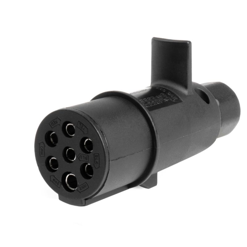 ΠΡΙΖΑ ΚΟΤΣΑΔΟΡΟΥ 7ΡΙΝ TYPE-N ΘΗΛΥΚΗ ΑMiO - 1 TEM. Πρίζα κοτσαδόρου με 7 pin θηλυκό TYPE-N, από την εταιρεία ΑMiO, πολωνικής προέλευσης. Εξασφαλίζει τη μόνιμη σύνδεση της ηλεκτρικής εγκατάστασης του ρυμουλκούμενου με το ρυμουλκό όχημα, διασφαλίζοντας την αδιάλειπτη λειτουργία των διαθέσιμων λειτουργιών (π.χ. φωτισμός). -Universal, ταιριάζει σε κάθε τύπο ημιρυμουλκούμενου/ρυμουλκούμενου. -Εύκολη και γρήγορη τοποθέτηση. -Ανθεκτικό στις φθορές και στις καιρικές συνθήκες με περίβλημα από σκληρό πλαστικό. -Με παχιά τσιμούχα που προστατεύει το εσωτερικό από τη βρωμιά. -Τάση: 24V. -Σύνδεσμος: βύσμα τύπου N, θηλυκός σύνδεσμος χωρίς ακίδες. -Περίβλημα: συμπαγές πλαστικό. -Σύνδεση: βιδωτή. -Μέγιστη διάμετρος καλωδίου: 9,1 mm. -Μαύρο χρώμα. -Μήκος βύσματος: 110 mm. -Βάρος: 120 γρ. Συσκευασία 1 τεμαχίου
