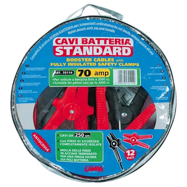 ΡΕΥΜΑΤΟΔΟΤΕΣ STANDARD (ΚΑΛΩΔΙΑ ΦΟΡΤΙΣΗΣ) - 12V - 70A. - Για βενζινοκινητήρες μέχρι 2000cc. - Με καλώδια μήκους 250 cm. - Νάιλον τσάντα με φερμουάρ. - Με εγχειρίδιο ασφαλείας.