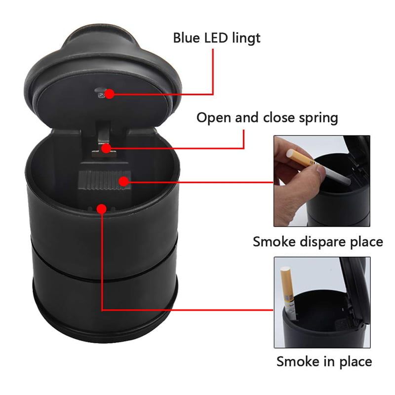 Λυχνία LED η οποία ανάβει αυτόματα όταν ανοίγει το καπάκι Εύκολη στήριξη και σβήσιμο του τσιγάρου Δεν διαχέεται καπνός όταν είναι κλειστό Μικρό και πρακτικό μέγεθος Για το αυτοκίνητο, γραφείο, σπίτι Διάμετρος βάσης: 6,6cm Συνολικό ύψος: 9cm Διαστάσεις: 9 x 6,6cm