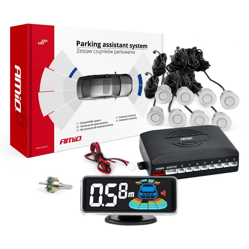 ΣΥΣΤΗΜΑ ΠΑΡΚΑΡΙΣΜΑΤΟΣ 12V ΜΕ 8 ΑΙΣΘΗΤΗΡΕΣ ΣΕ ΑΣΗΜΙ ΧΡΩΜΑ 21,5mm ΜΕ BUZZER (ΗΧΟ) ΚΑΙ ΟΘΟΝΗ LED 3D ΑΜΙΟ - 1 τεμ. Σύστημα παρκαρίσματος με 8 αισθητήρες σε ασημί χρώμα με ήχο και οθόνη led από την εταιρεία AMiO, πολωνικής προέλευσης, Η συσκευή είναι απλή και λειτουργική, ξεκινά αυτόματα. Κατά την όπισθεν ή τη στάθμευση, η συσκευή αναγνωρίζει σωστά τα εμπόδια στο δρόμο και προειδοποιεί τον οδηγό με έναν ήχο(κατάλληλο για την απόσταση από το εμπόδιο), καθώς και πληροφορίες που εμφανίζονται στην οθόνη. -Τροφοδοτικό: 12V DC -Κατανάλωση ισχύος: <4W -Συχνότητα λειτουργίας: 40KHz -Θερμοκρασία λειτουργίας της συσκευής: -30°C έως +55°C -Ανίχνευση εμποδίου: 2,5 - 0,3 m -Σφάλμα μέτρησης: +/- 5cm -Τρύπα στερέωσης: 21,5mm -Η εξωτερική διάμετρος των αισθητήρων: είναι 24,5 mm -Μήκος καλωδίων αισθητήρα: 2,2 m -Μήκος καλωδίου από την οθόνη: 5m Το σετ περιλαμβάνει αισθητήρες που μπορούν να τοποθετηθούν στο μπροστινό ή στο πίσω μέρος του αυτοκινήτου. Οι αισθητήρες ενεργοποιούνται αυτόματα όταν μπαίνει η όπισθεν για τους πίσω αισθητήρες ή με το πάτημα του πεντάλ του φρένου για τους μπροστινούς αισθητήρες. Το σύστημα θα ενεργοποιηθεί όταν εντοπιστεί ένα εμπόδιο σε απόσταση 80 cm από το όχημα. Η ανίχνευση ενός εμποδίου σηματοδοτείται με ένδειξη της απόστασης, γραφική απεικόνιση και, επιπλέον, ήχο μέσω του ενσωματωμένου μεγαφώνου. Οι αισθητήρες είναι εντελώς αδιάβροχοι. Είναι επίσης ανθεκτικά σε καιρικές συνθήκες όπως χιόνι, βροχή ή ομίχλη. Το κιτ περιλαμβάνει τα απαραίτητα στοιχεία συναρμολόγησης. Συσκευασία 1 τεμαχίου