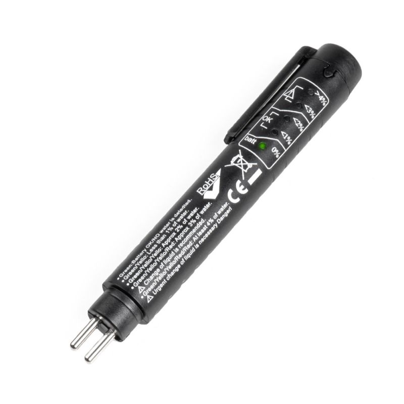 Σας επιτρέπει να μετράτε άμεσα την περιεκτικότητα σε νερό στο υγρό φρένων, ανεξάρτητα από το μοντέλο αυτοκινήτου που διαθέτετε. Απλώς βυθίστε τα ηλεκτρόδια του ελεγκτή στη δεξαμενή υγρού φρένων και διαβάστε την ένδειξη των διόδων ελέγχου. Η συσκευή είναι σε θέση να δοκιμάσει πολλούς τύπους υγρών φρένων (DOT 3, DOT 4, DOT 5, DOT 5.1).