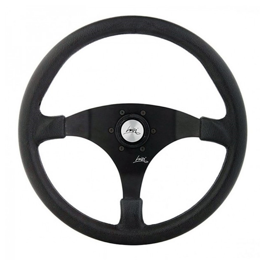 Τιμόνι αυτοκινήτου της POLYURETHANE/TANEGUM σειράς από την εταιρία LUISI, ιταλικής προελεύσεως σε μαύρο χρώμα και χρωμιομένο διακοσμητικό καπάκι με logo στο κέντρο του, κατασκευασμένο από καουτσούκ (tanegum) και μεταλλική μαύρη λάμα. Διαθέτει λαβή με ελαφρώς σαγρέ υφή και 3 μεταλλικές ακτίνες (μπράτσα) σε ημικύκλια καμπυλωτή γραμμή. Έχει universal εφαρμογή, για να ταιριάζει στα περισσότερα μοντέλα αυτοκινήτων και προσφέρει ασφαλές, άνετο κράτημα, προσδίδοντας παράλληλα μία μοναδική κομψότητα στο εσωτερικό του οχήματος. Εύκολη και γρήγορη τοποθέτηση.